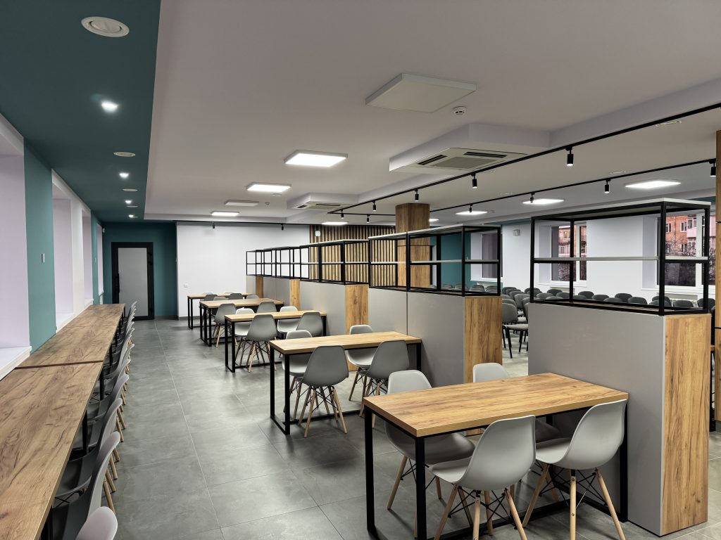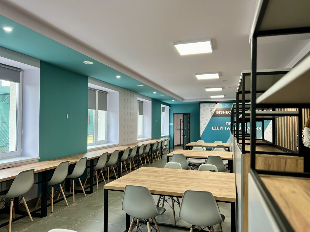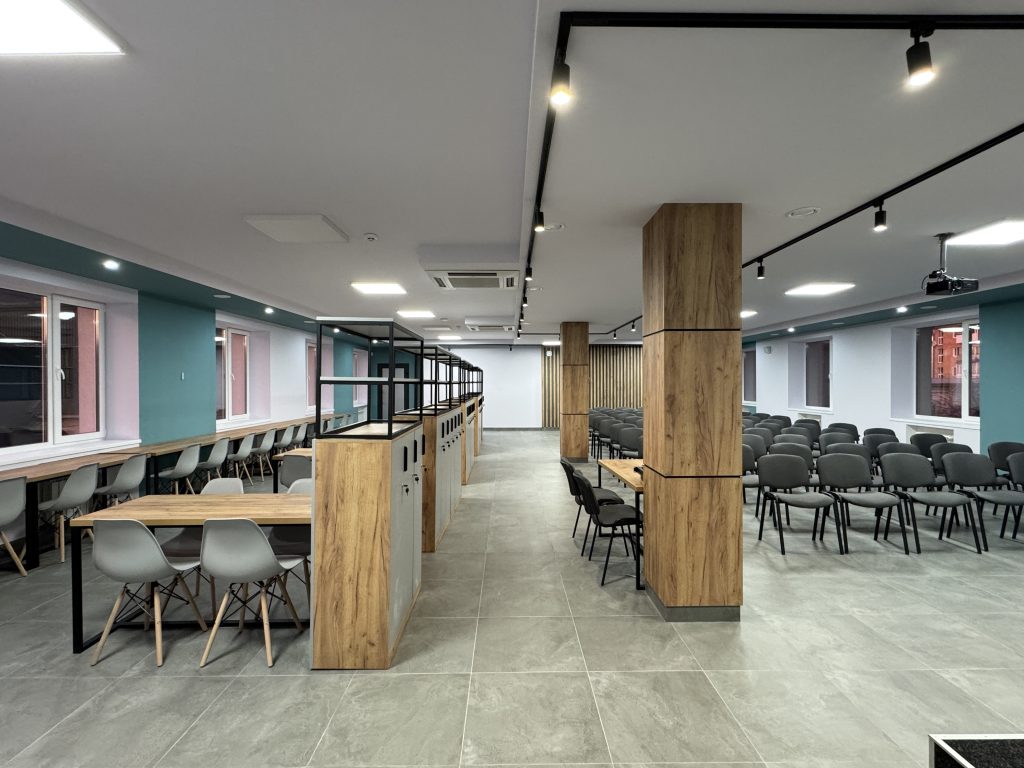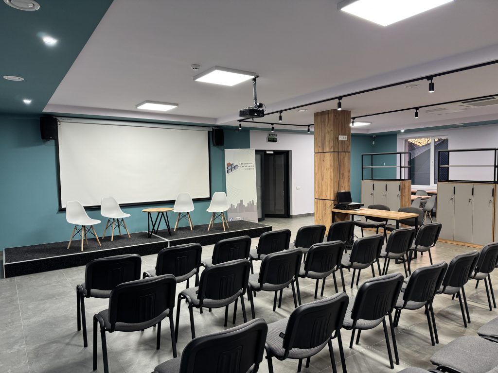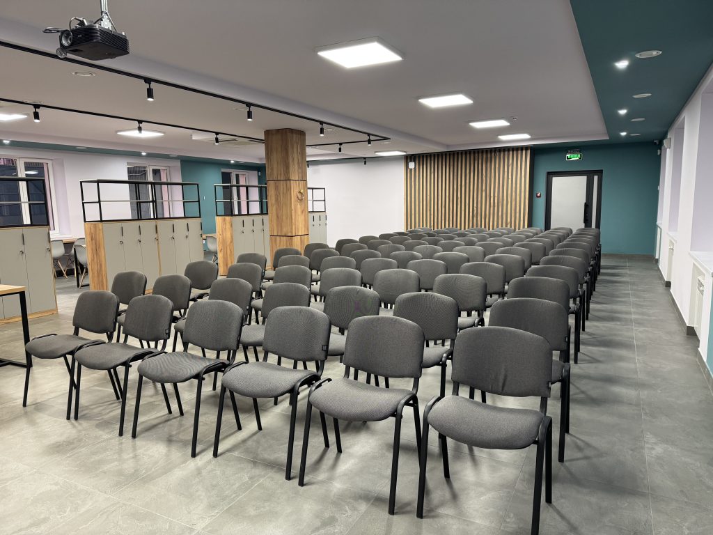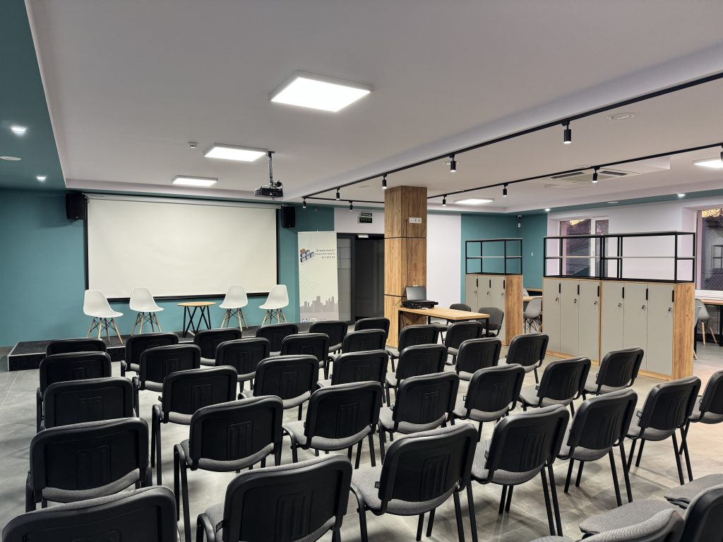 Конференц-зала – сучасний простір, який може вміщати до 100 осіб та який призначений для проведення галузевих форумів, стратегічних обговорень і заходів, спрямованих на розвиток громади та підприємництва..