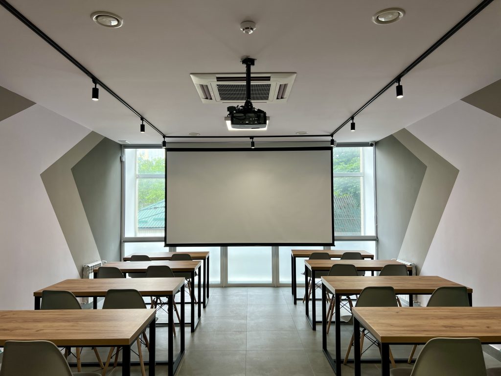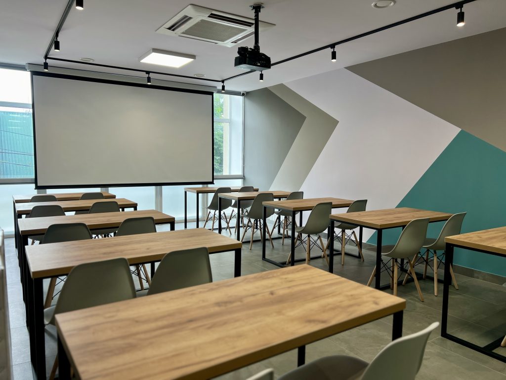Навчальна кімната – простір, який завдяки своєму модульному дизайну та змінній конфігурації швидко адаптується для проведення навчальних заходів, воркшопів, лекцій, тренінгів або організації зустрічей.
