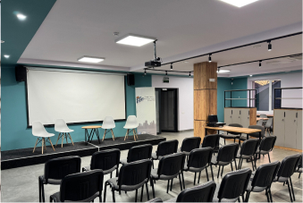 Агенція розвитку Рівного адмініструє багатофункціональний простір на другому поверсі будівлі, що включає конференц-залу для офіційних подій та робочих місць, навчальну кімнату для тренінгів і семінарів та кімнату для онлайн-перемовин із обладнанням для дистанційної та гібридної роботи.